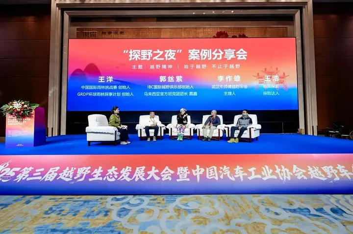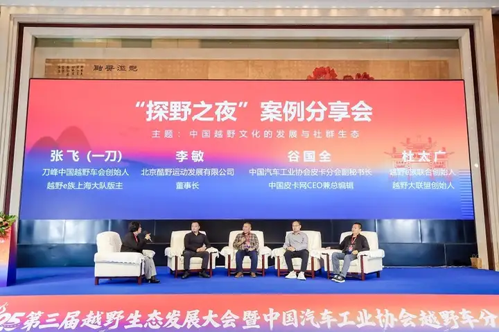 当晚举行的“探野之夜”案例分享会,将大会气氛推向另一个高潮。活动以两场精彩的圆桌论坛形式展开。第一场由襄阳达安汽车检测中心有限公司标准法规技术总监赵淑华主持,邀请刀峰中国越野车会创始人、越野E族上海大队版主张飞(一刀),北京酷野运动发展有限公司董事长李敏,中国汽车工业协会皮卡分会副秘书长、中国皮卡网CEO兼总编辑谷国全,越野e族联合创始人、越野大联盟创始人杜太广等圈层领袖,共同探讨越野俱乐部运营、赛事IP打造与用户社群培育的实战经验。